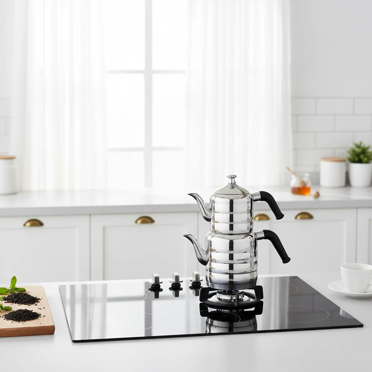 کتری و قوری مینا ماکسی کرکماز 036، یک سرویس چای‌ساز روگازی ساخت ترکیه است که با طراحی شیک و جنس استیل ضد زنگ ۱۸/۱۰ کروم-نیکل ساخته شده است و دوام و مقاومت بالایی در برابر زنگ‌زدگی ارائه می‌دهد. این سرویس دارای یک کتری با گنجایش ۲.۰ لیتر و یک قوری ۱.۱ لیتری است که مجموع ظرفیت مناسبی برای مصارف روزمره فراهم می‌کند. کفه کتری به صورت کپسولی (Super capsule base) طراحی شده تا انتقال حرارت یکنواخت و سریع را روی انواع اجاق‌ها از جمله القایی (اینداکشن)، تضمین کند. دستگیره‌های ارگونومیک باکالیت نسوز آن، استفاده ایمن و آسان را به ارمغان می‌آورد. کتری و قوری مینا ماکسی کرکماز 036 انتخابی ایده‌آل برای تجربه‌ی یک چای خوش‌طعم و باکیفیت است.