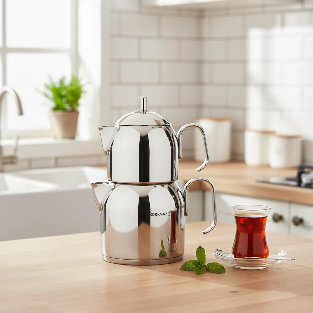 کتری و قوری 0.65 + 1.2 لیتر استیل براق پرا کرکماز 281
